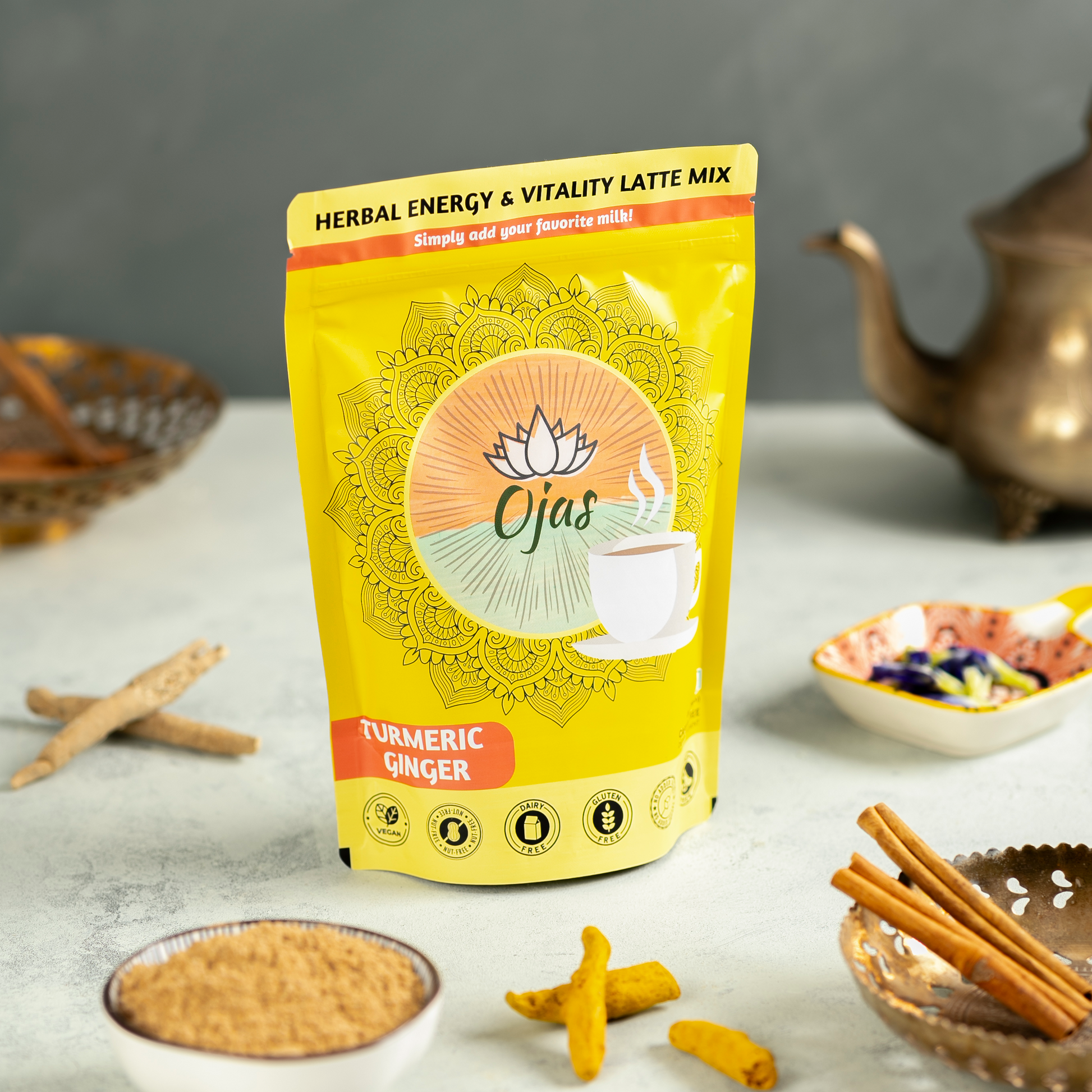This soothing Turmeric Ginger blend is perfect for a chilly winter day or when life feels overwhelming. Froth it with oat milk for extra warmth. In Ayurveda, turmeric supports immunity and reduces inflammation, while ginger aids digestion and boosts circulation, creating a calming, restorative experience.