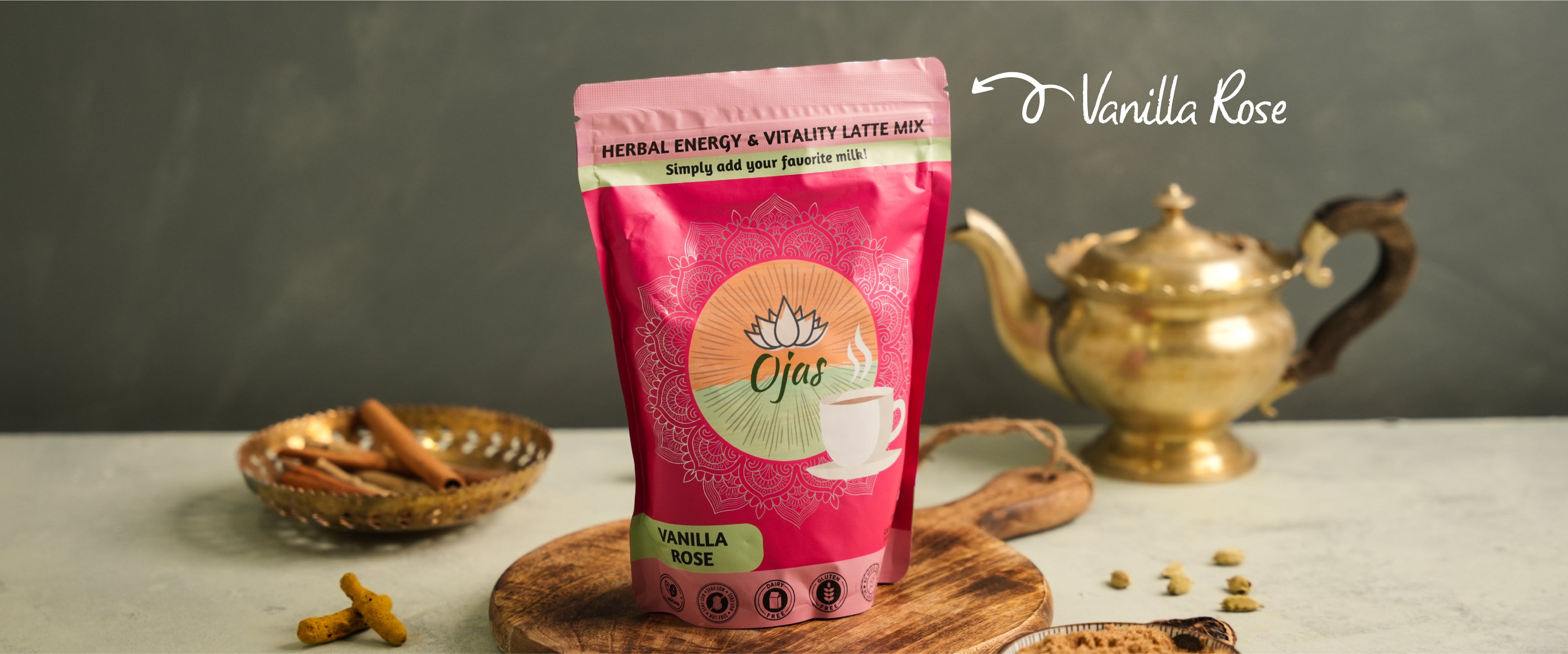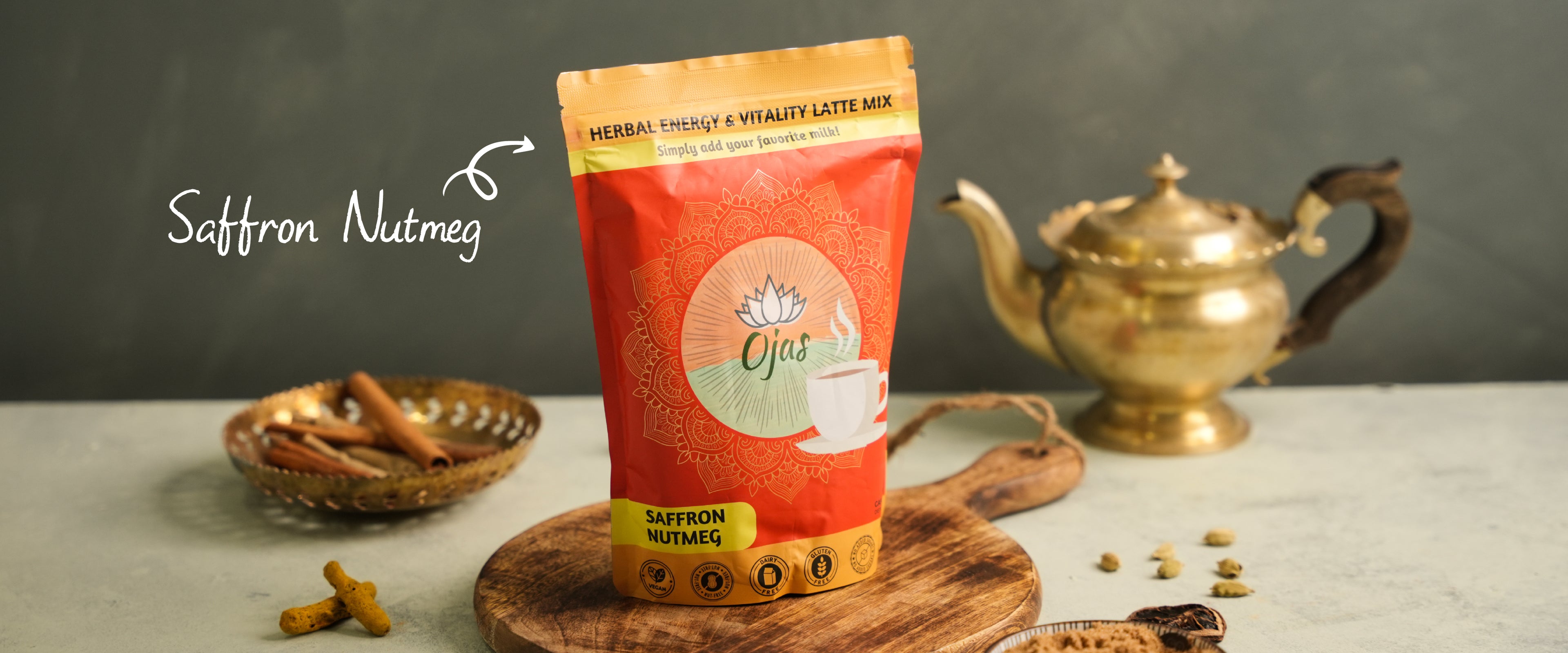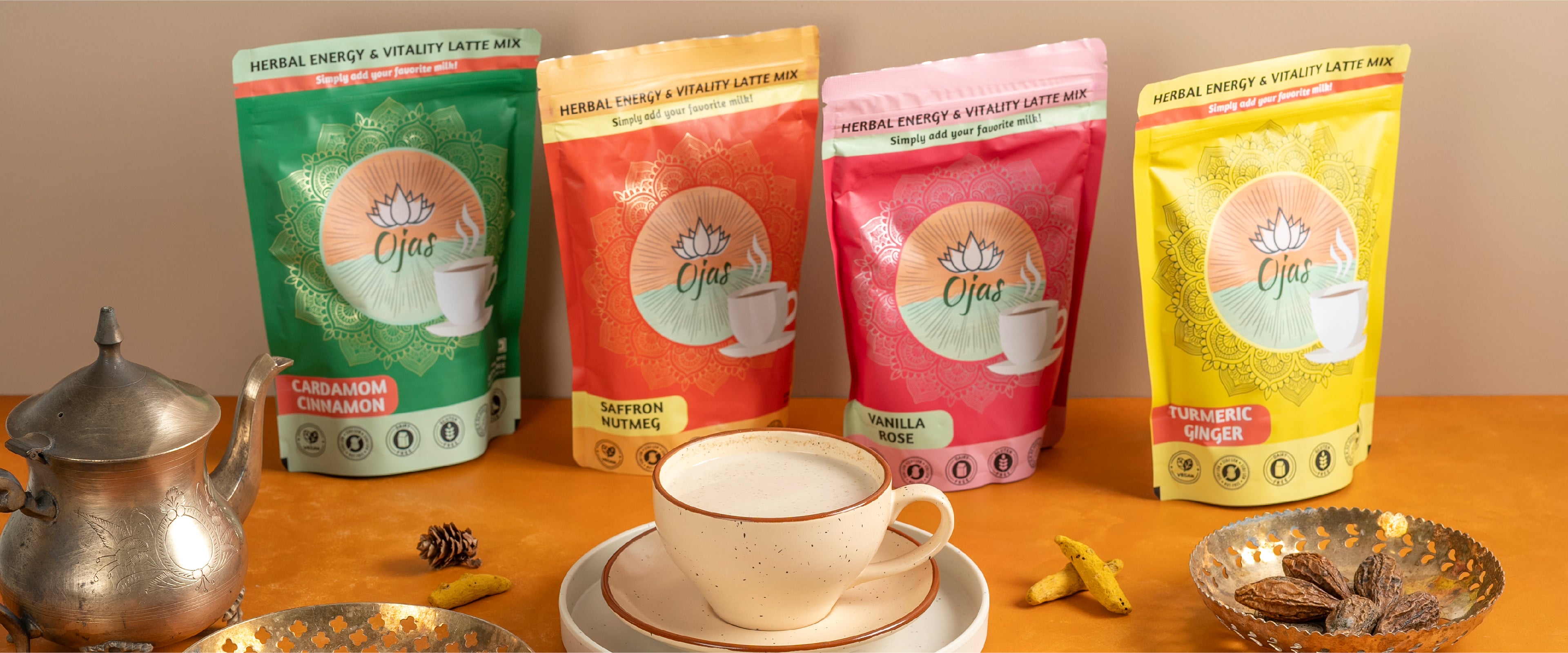 Step 2. Add 1-2 Tsps of Ojas drink mix to your cup of warm milk.